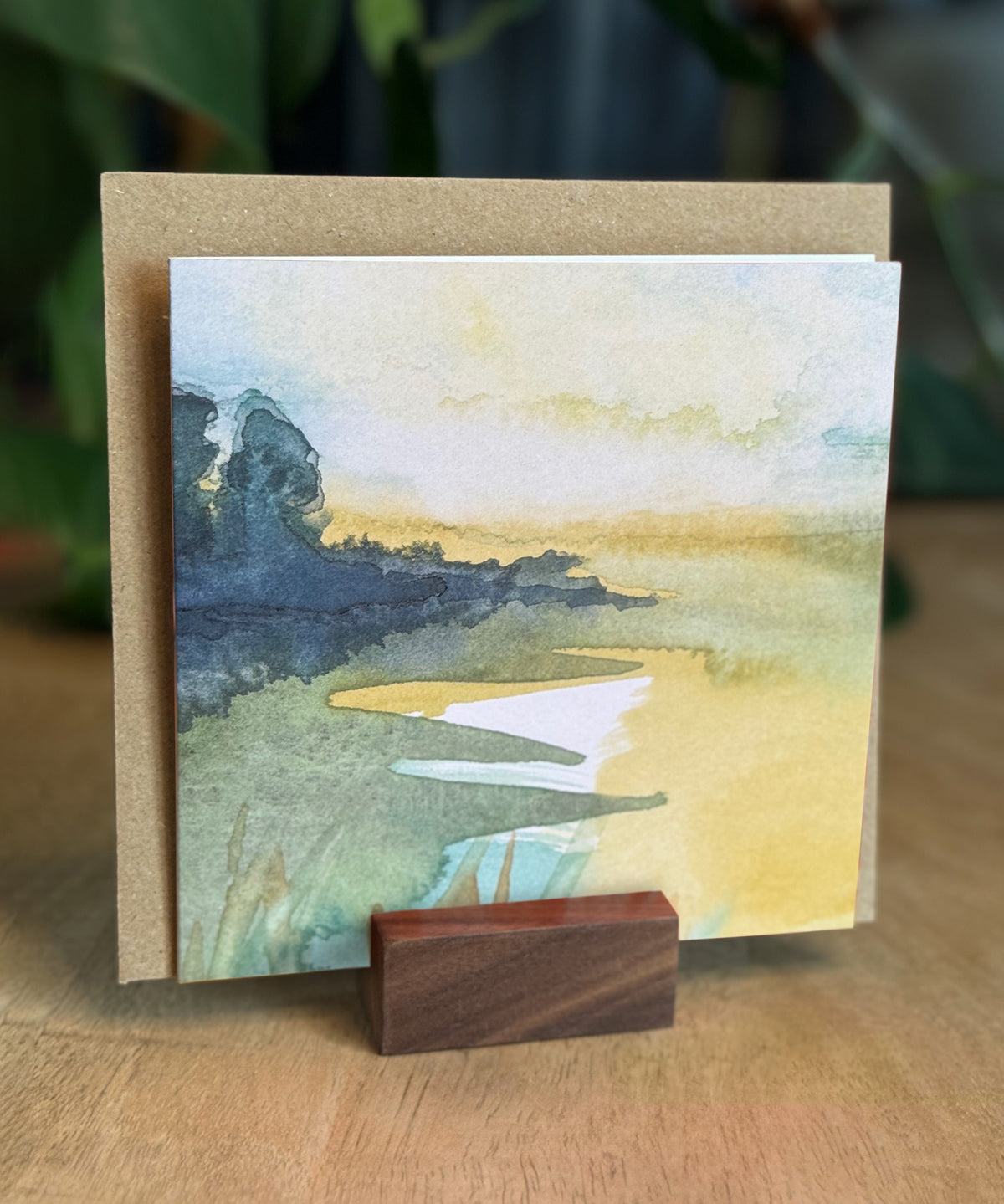Our “Golden Morning” All-Occasion Blank Note and Thank You Card captures the calm of golden hour in soft washes of watercolor. With layered greens, golds, and hints of misty blue, this peaceful design sets the tone for heartfelt messages and quiet reflections. It’s the kind of card you’ll reach for again and again—tuck it inside a gift, leave it on a doorstep, or drop it in the mail just because.