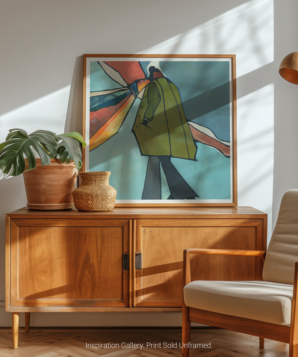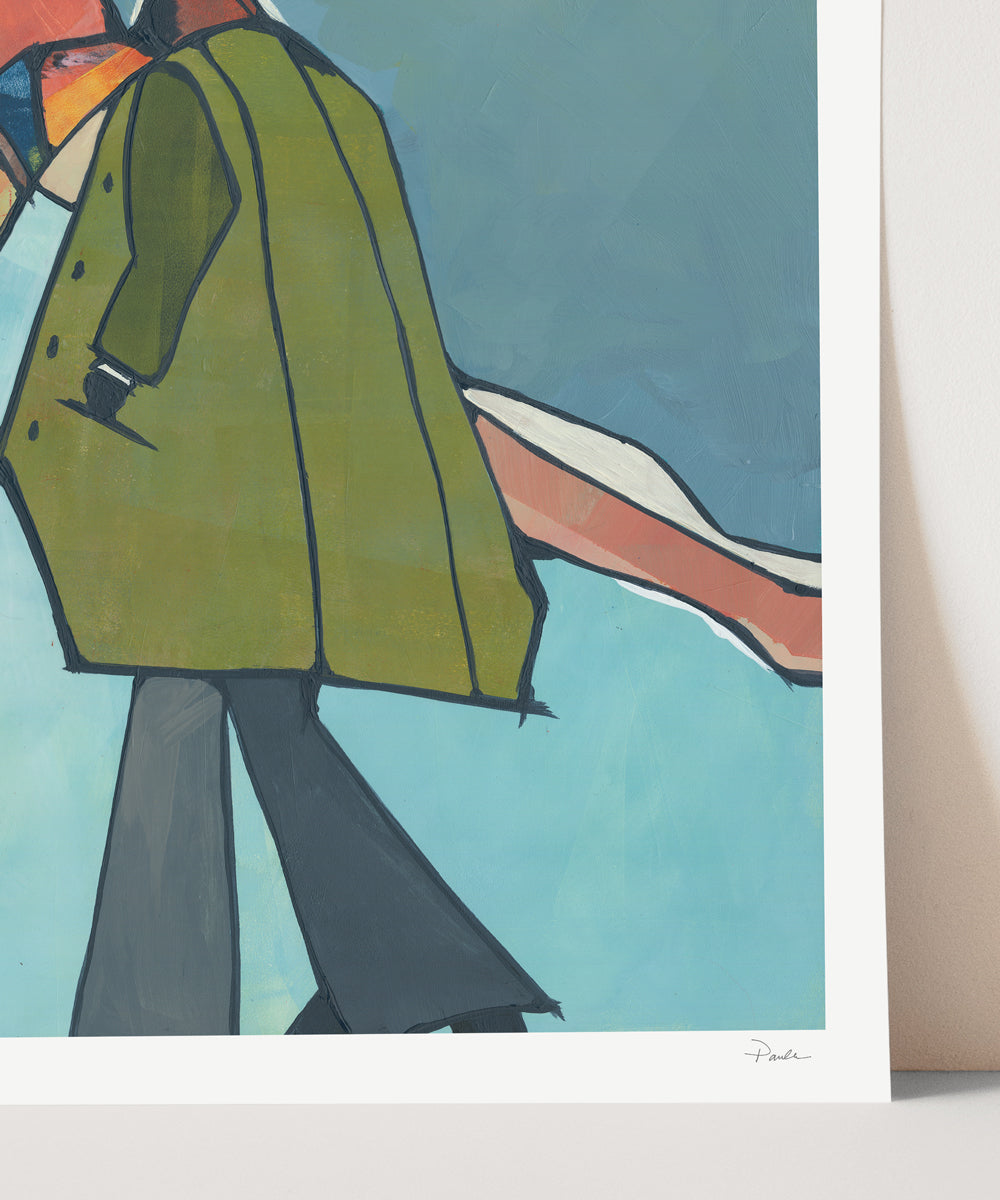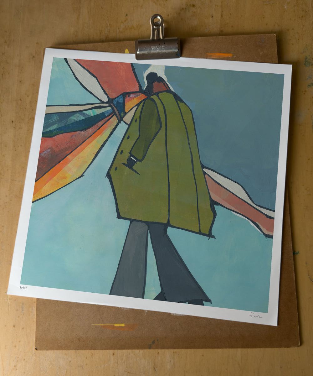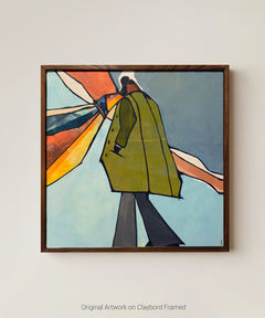 "Archer," from my Abstracted Figures collection, strides across a sky-blue field in a chartreuse coat, framed by ribbons of bold color. He’s sharp and a little enigmatic—an offbeat figure who brings instant character to any wall.
