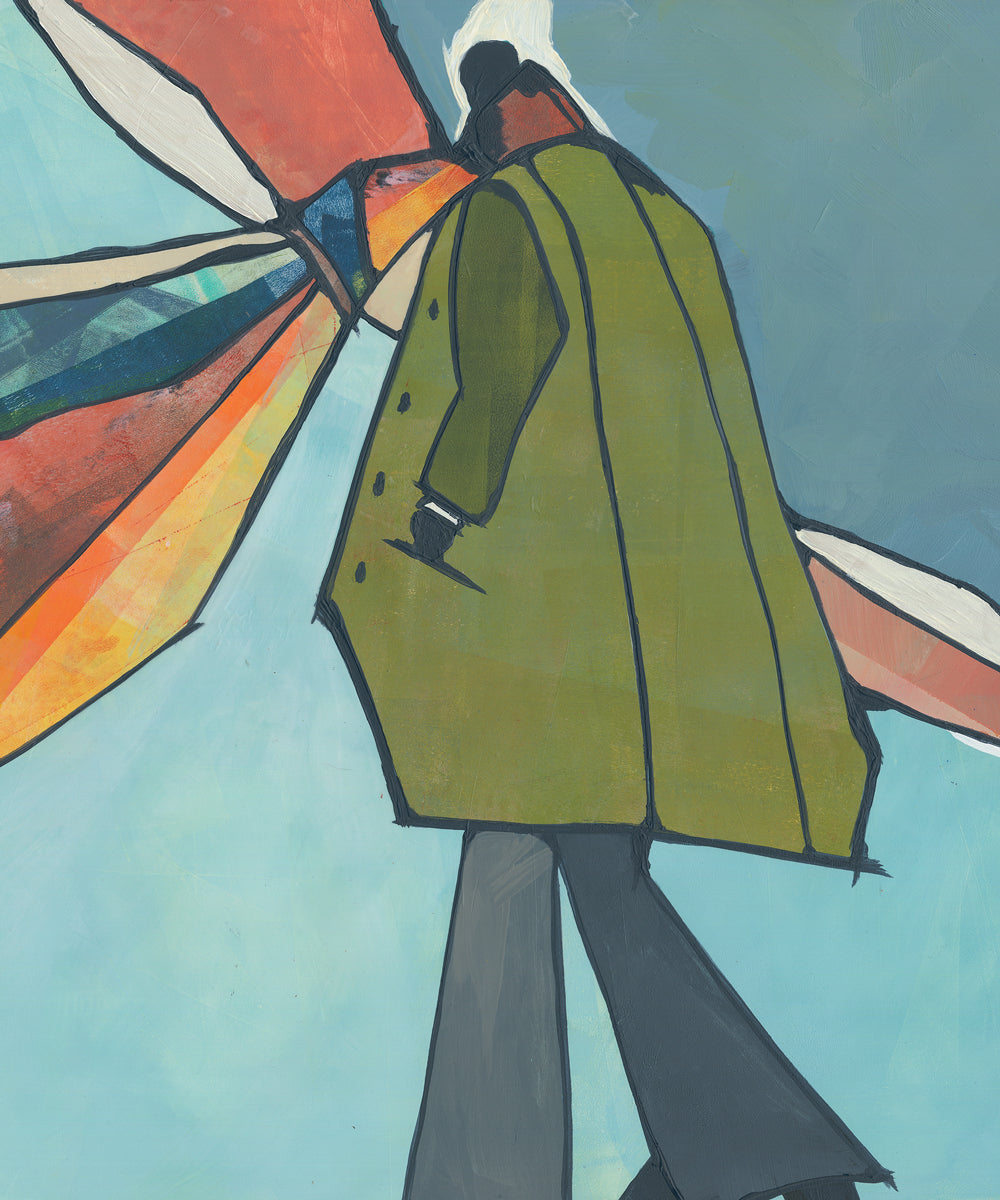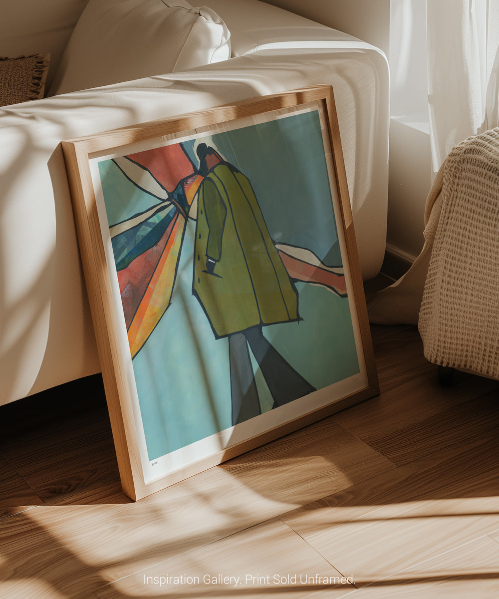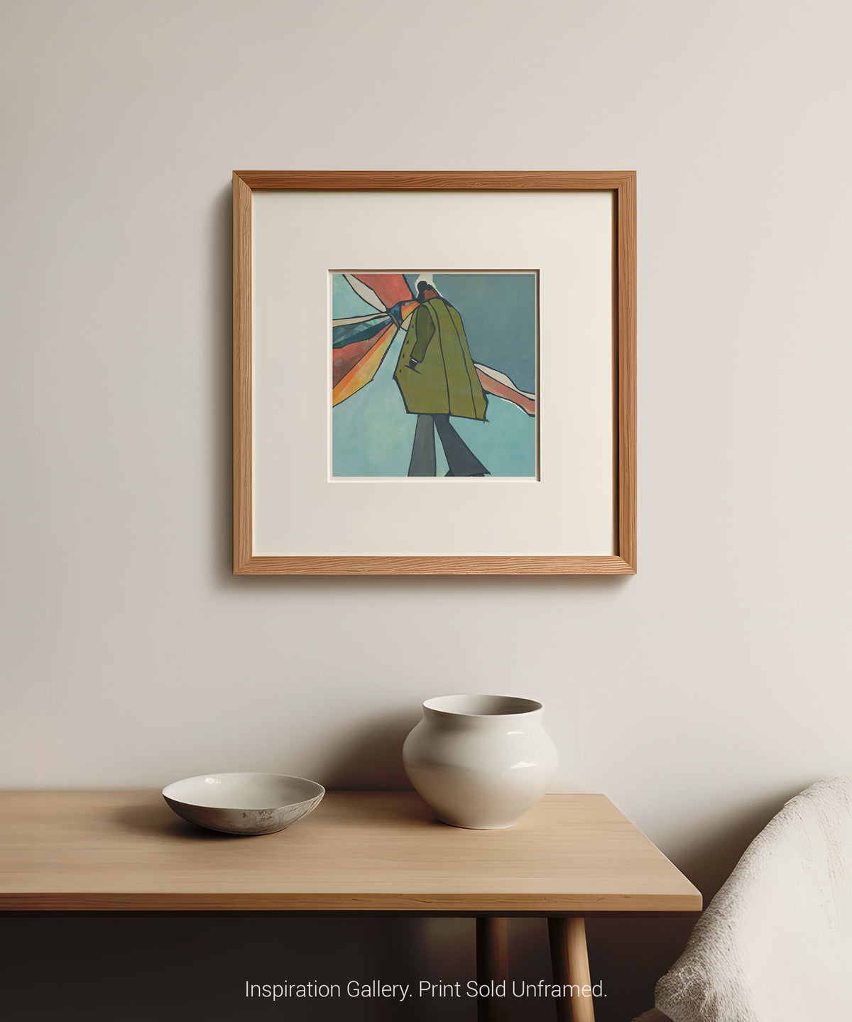 "Archer," from my Abstracted Figures collection, strides across a sky-blue field in a chartreuse coat, framed by ribbons of bold color. He’s sharp and a little enigmatic—an offbeat figure who brings instant character to any wall.
