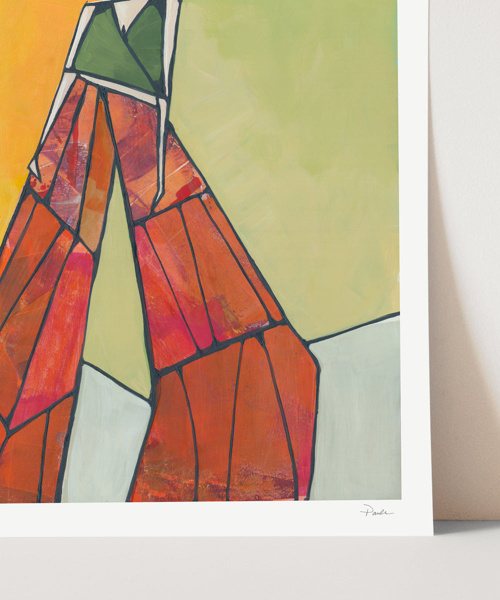 "Ashlie", from my Abstracted Figures collection, mixes coral-red block shapes with crisp graphic lines. She’s bold and a little offbeat—bringing a quirky accent that livens up any room.