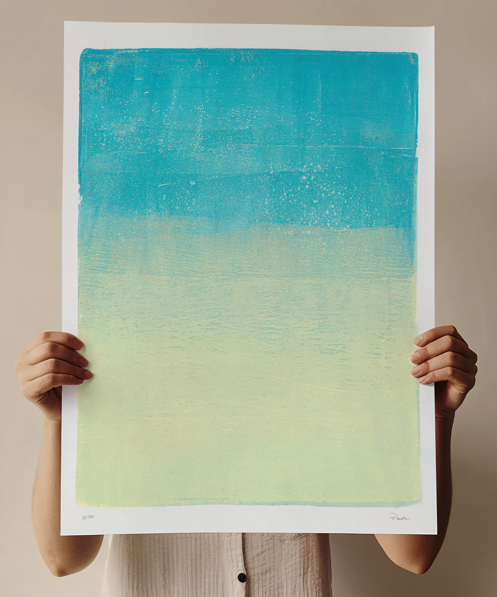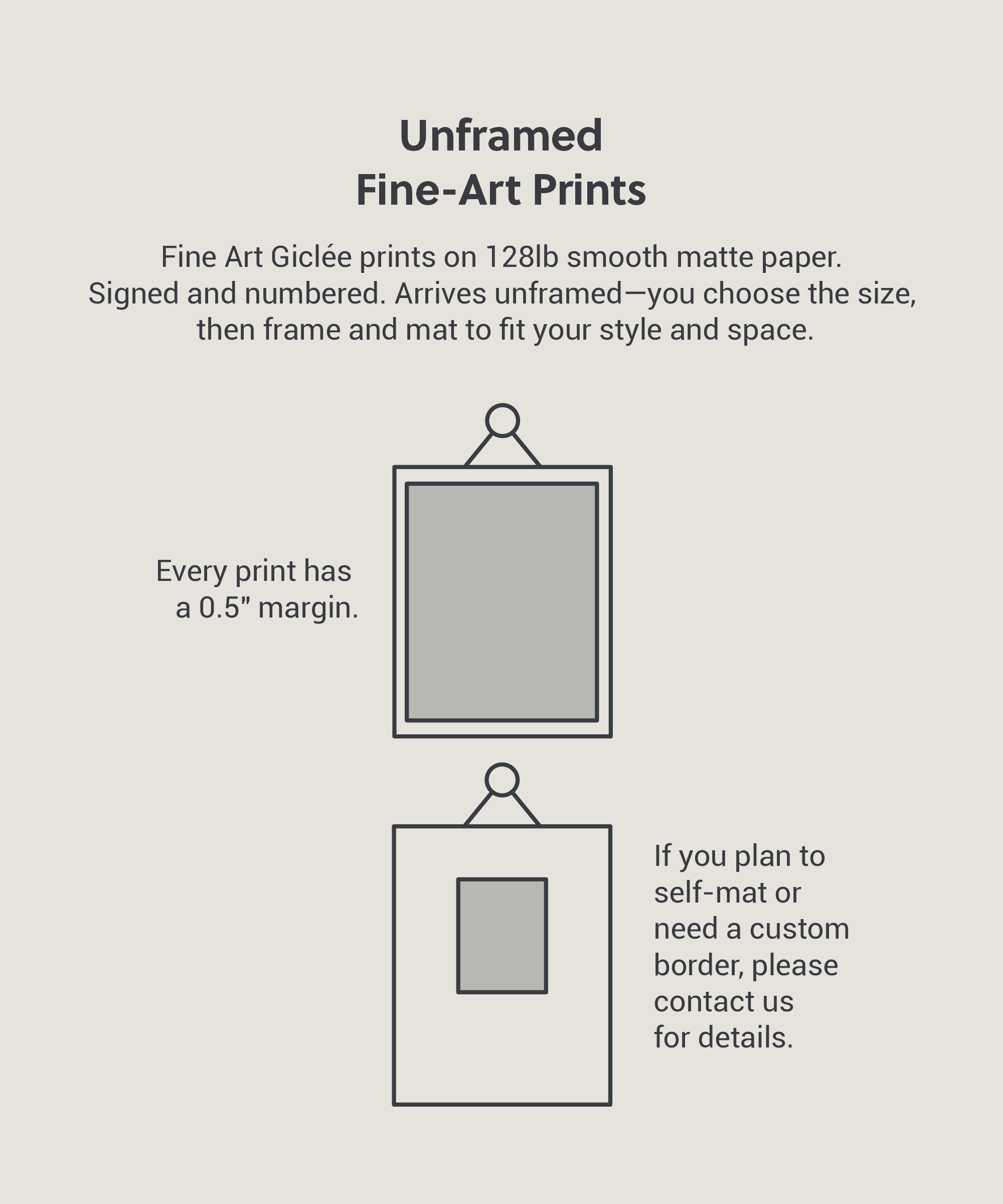 Fine Art Giclée prints on 128lb smooth matte paper, reproduced from the original hand-pulled monotype print. Signed and numbered.