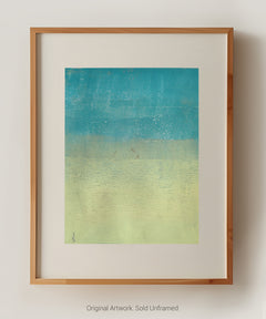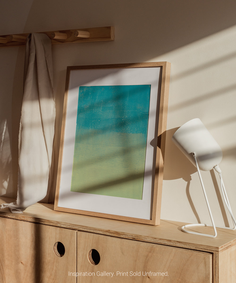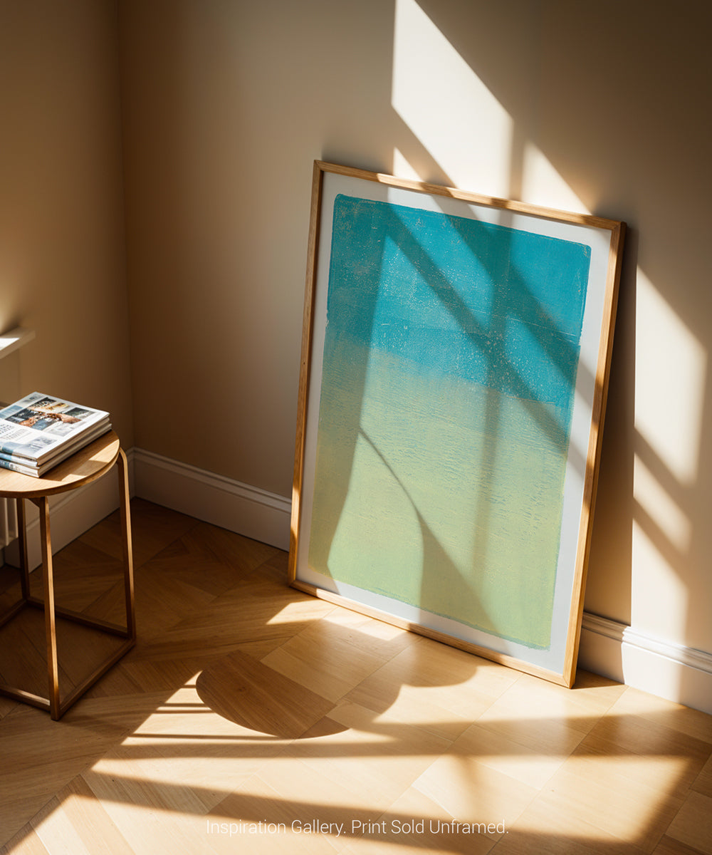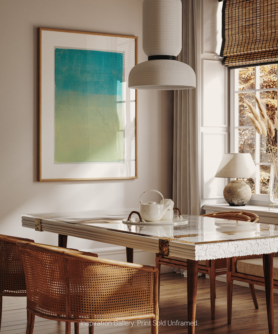 Soft bands of aqua fading to green give "Seaglass Color Block" its serene presence. Clean and minimal, it’s a versatile piece that works as a gentle accent in both coastal and contemporary spaces, and pairs beautifully with "Seaglass" as a companion.