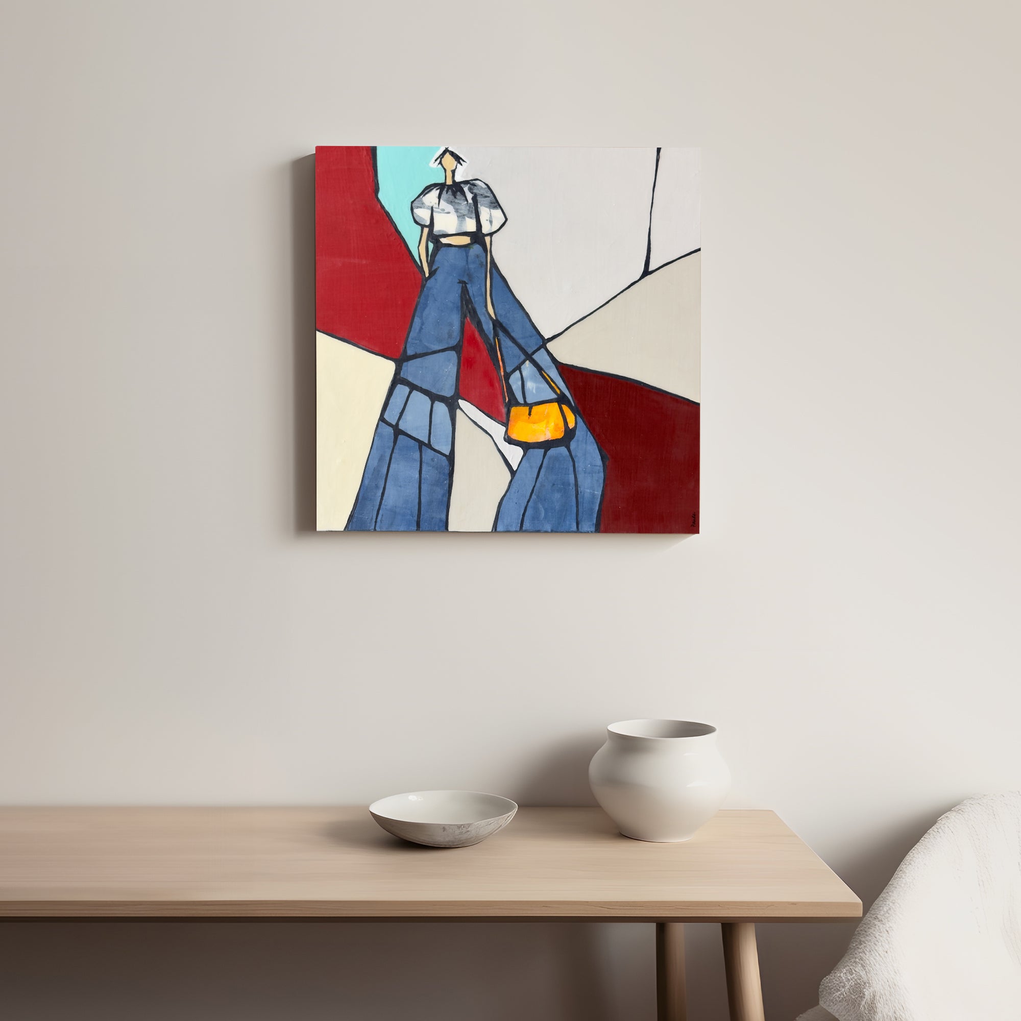 Features a playful, abstracted female figure, blending textured layers in muted hues of red, white, blue, and teal. With an Americana vibe, “Abby” is a fun-loving character with a hint of country charm.