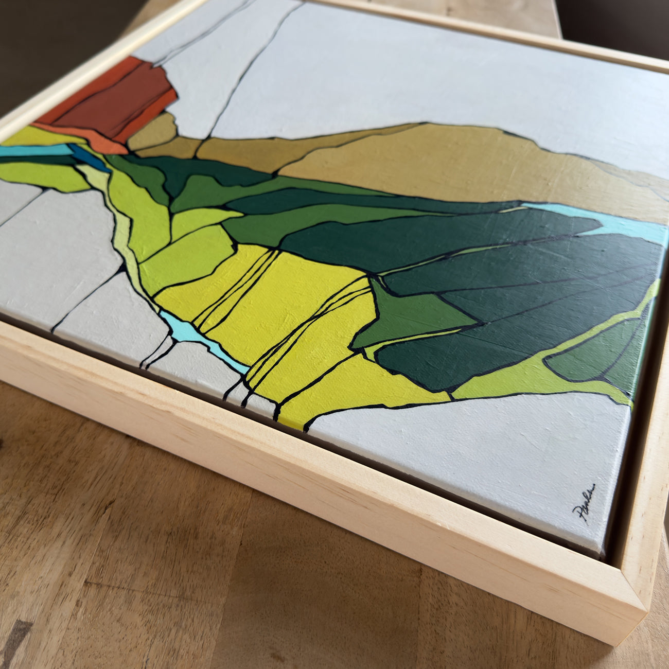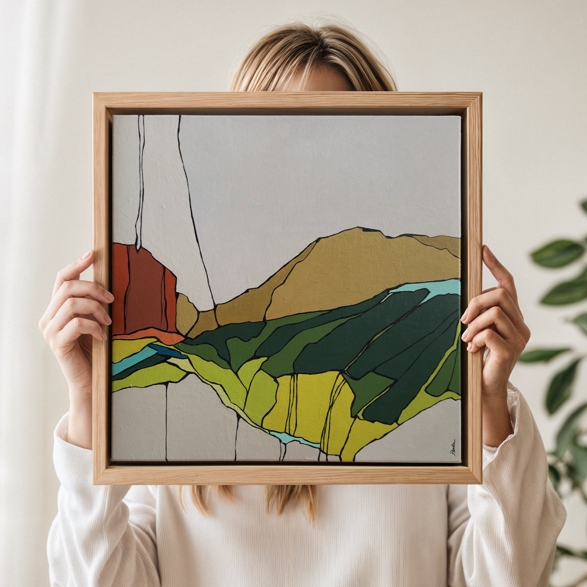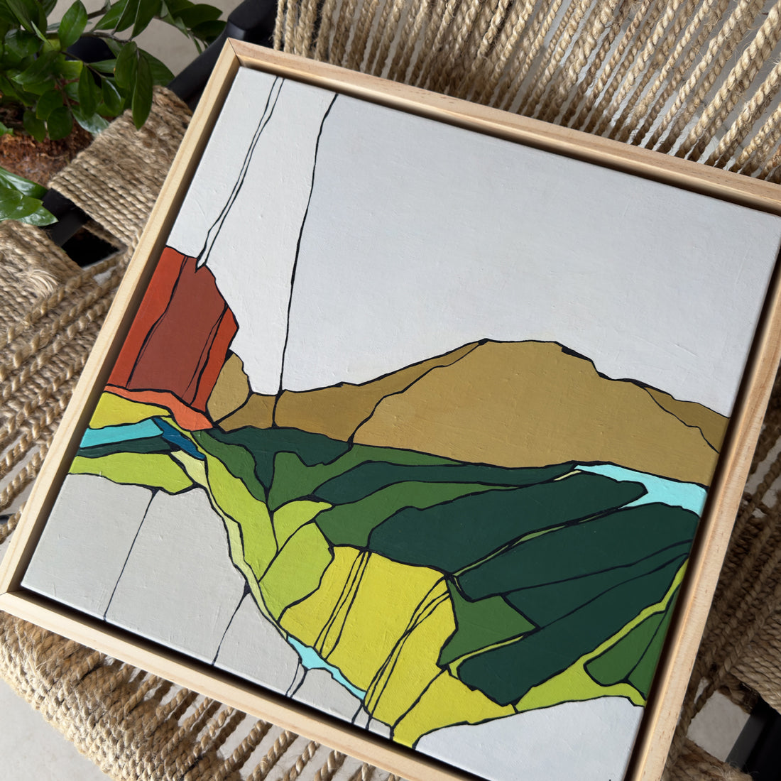 Original landscape on canvas. Acrylic. 16×16” unframed. Cradled natural wood frame: 17.5×17.5”, 1.5” deep.