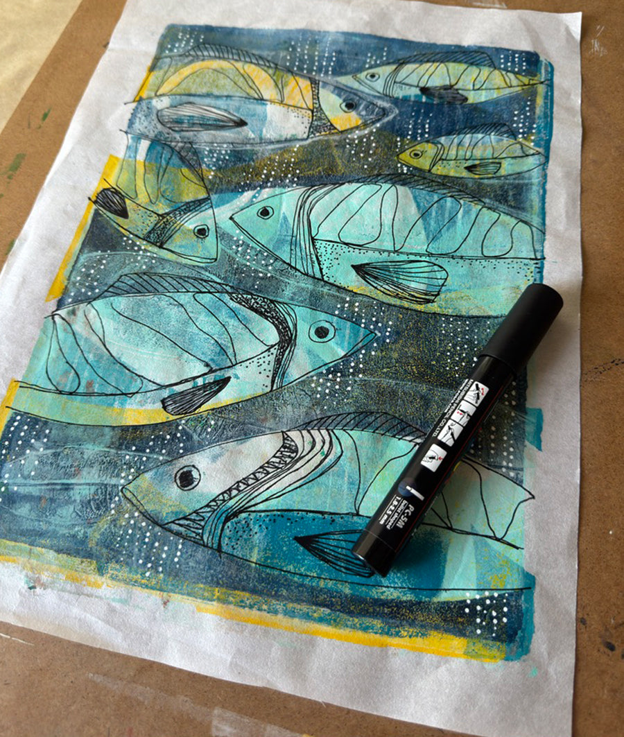 In the second session, we’ll return to those prints and add linework with acrylic pens—drawing into the layers to create movement, rhythm, and artworks that ripple with pattern and personality.